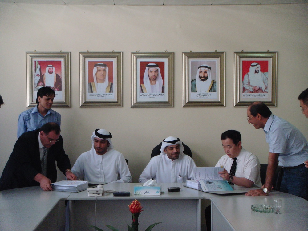 中材節能市場部部長王毅及市場經理李浩、劉志斌、洪會林等與阿聯酋UCC水泥公司董事長Mr.Rami、總經理Mr.Yasir、生產廠長Mr.Ibrahim、項目經理Mr.Nasser及業主方咨詢顧問共同見證了這個歷史時刻。