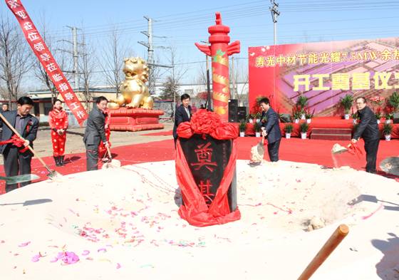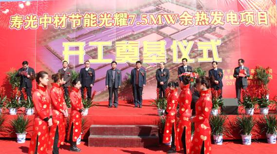 2012年3月11日上午10點18分,中材節能股份有限公司首個玻璃行業余熱發電項目——壽光中材節能光耀7.5MW余熱發電項目開工奠基儀式在山東壽光隆重舉行。
