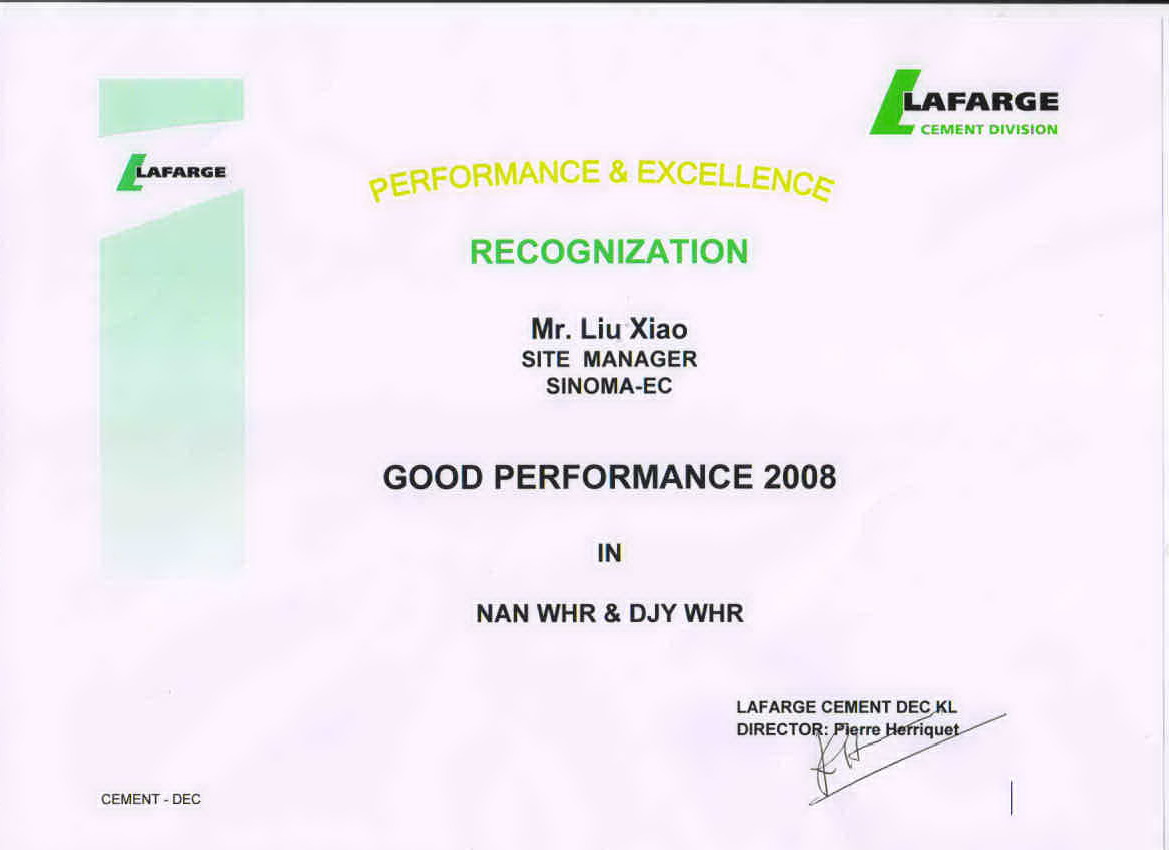 拉法基頒發(fā)給現(xiàn)場(chǎng)經(jīng)理劉宵的榮譽(yù)證書(shū)