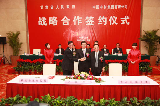 周育先(中)、馬艾武(右)、楊皓代表中材集團(tuán)、甘肅省國資委、祁連山建材