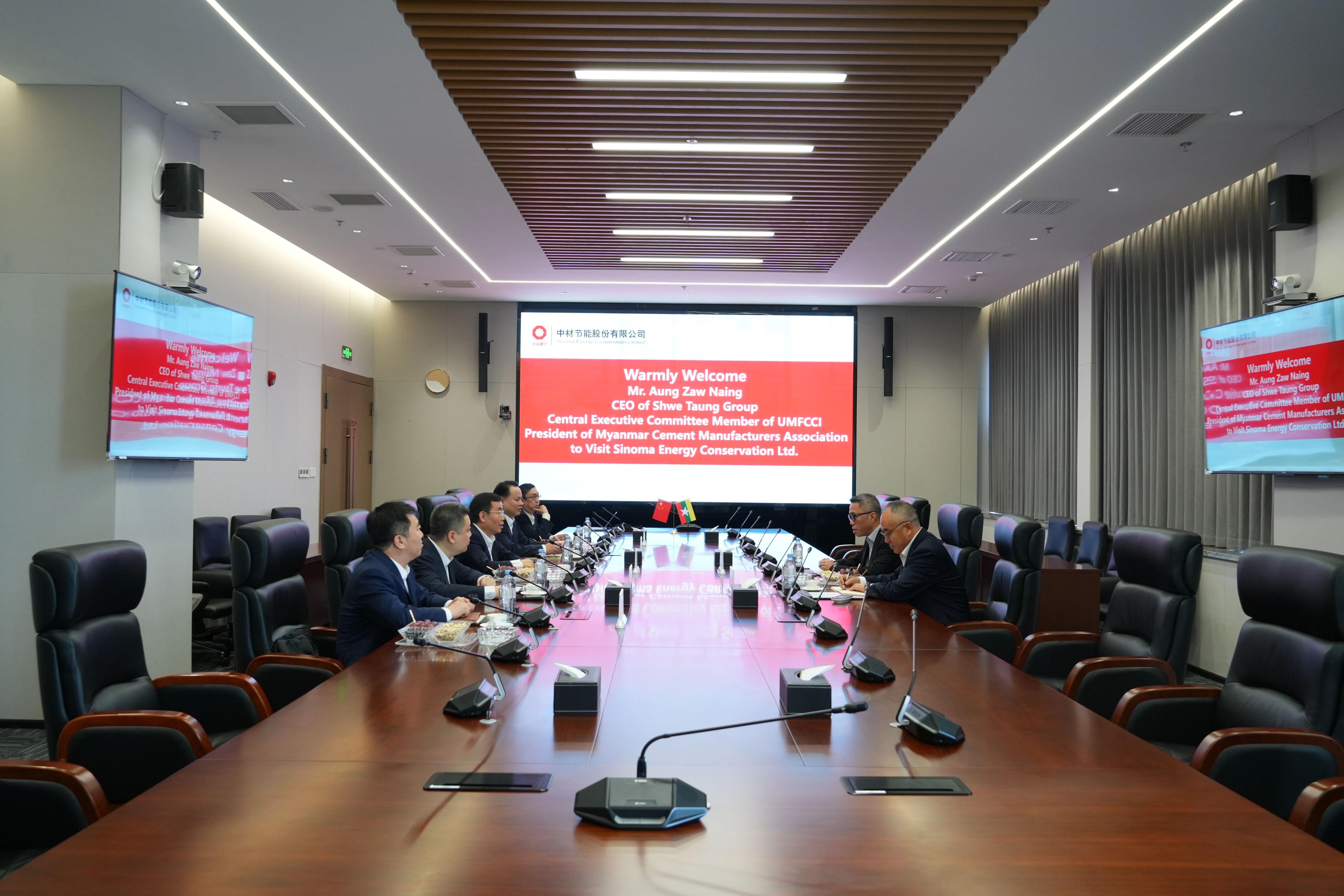 On the morning of August 29th, Meng Qinglin, Chairman of Sinoma Energy Conservation Limited, warmly received a delegation led by Aung Zaw Naing in Tianjin. Aung Zaw Naing serves as the CEO of Shwe Taung Group, President of the Myanmar Cement Manufacturers Association, and a Central Executive Committee Member of the Union of Myanmar Federation of Chambers of Commerce and Industry (UMFCCI). The two sides engaged in in-depth discussions on further deepening cooperation. Liu Xin, President of Sinoma Energy Conservation Limited, also participated in the meeting.